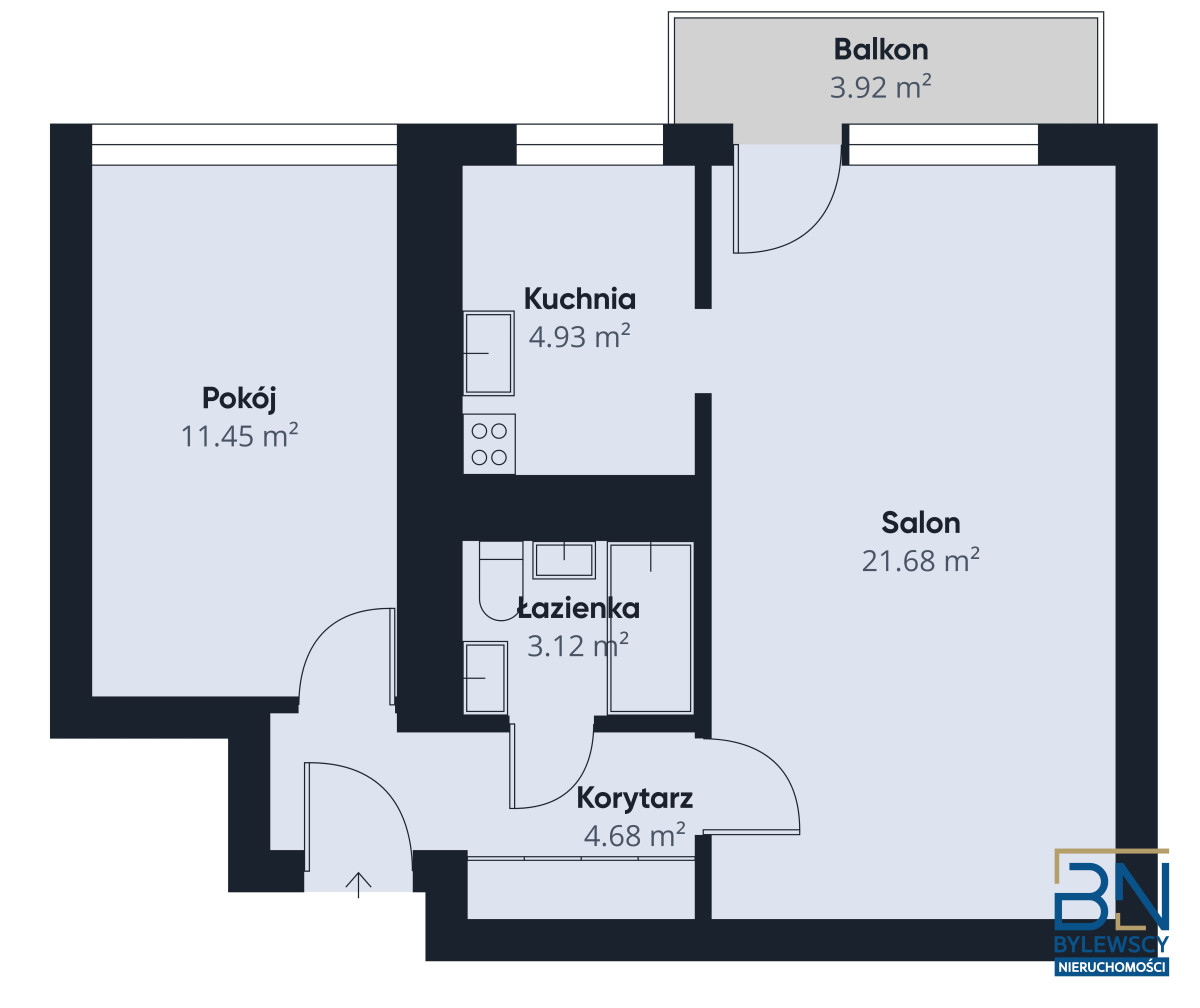 – kuchnia (4,93 m2) – osobna, z oknem (wejście do kuchni z salonu)
