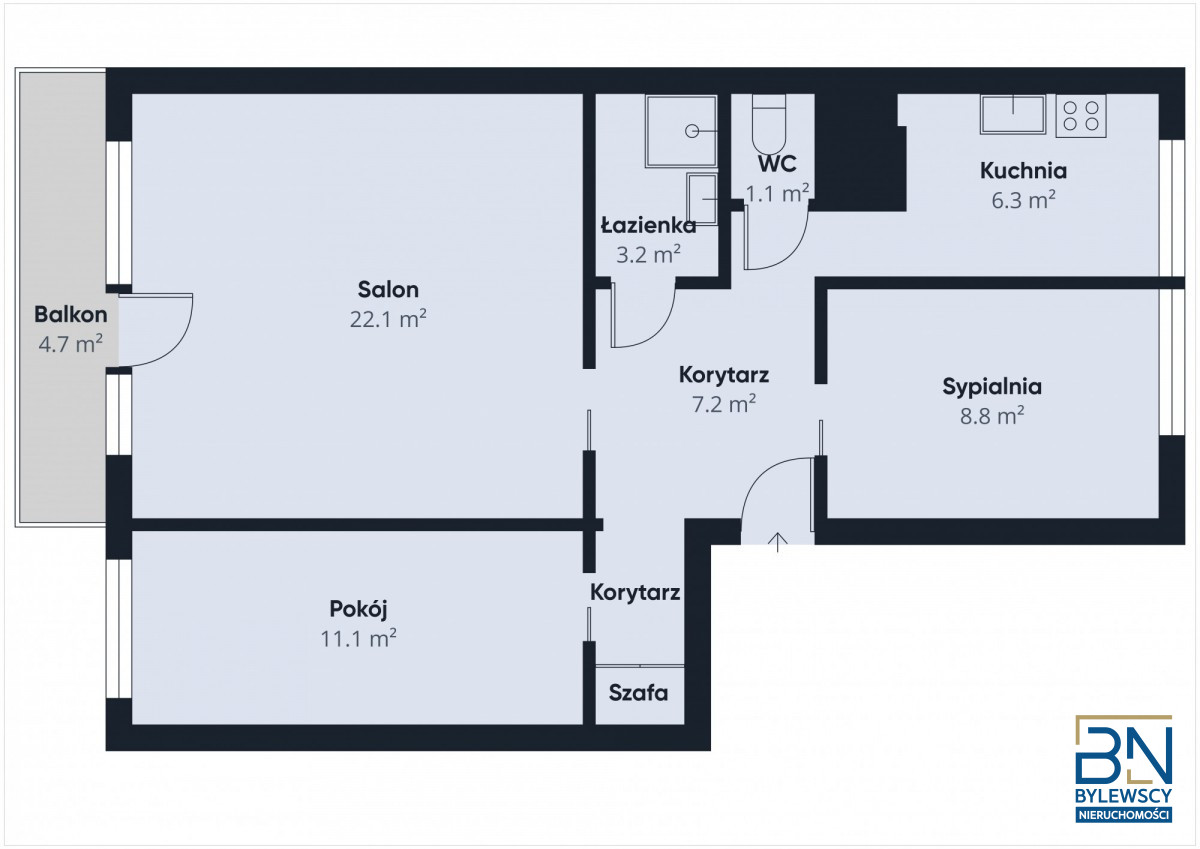– salon (ponad 21 m²) z wyjściem na dużą loggię – idealne miejsce na odpoczynek z widokiem na zieleń
