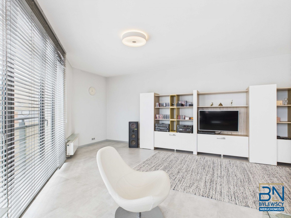 – duży salon z dużymi przeszkleniami, sofą, szafkami i TV