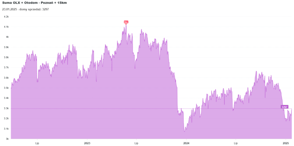 Rynek domów na sprzedaż wyróżnia się mniejszą liczbą ofert, ale jednocześnie stabilnym poziomem transakcji. Choć nie jest to segment dynamiczny, domy wciąż znajdują nabywców. W porównaniu do mieszkań podaż domów jest znacznie mniejsza, co przyczynia się do utrzymania stabilnych cen.
