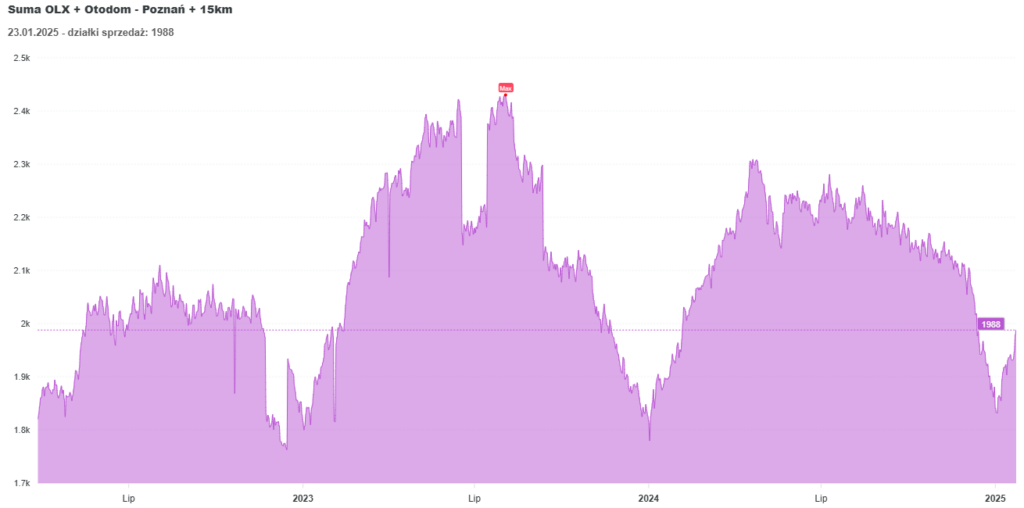Rynek działek wykazuje większą stabilność w porównaniu do mieszkań. Zarówno popyt, jak i podaż pozostają na względnie stałym poziomie, co przekłada się na brak wyraźnych wahań cenowych. Działki są najczęściej wybierane przez osoby planujące budowę domu, co nadal cieszy się popularnością jako alternatywa dla mieszkań w zatłoczonych miastach.