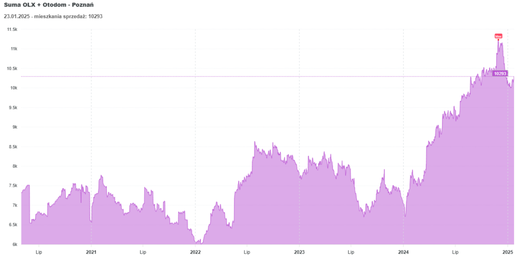 Nadpodaż ofert zmusza właścicieli do obniżania cen, aby przyciągnąć nabywców. Od początku 2024 roku na portalach (Otodom i OLX) pojawiło się ponad 4 tysiące nowych ofert, co doprowadziło do rekordowej prawie liczby mieszkań dostępnych na sprzedaż – ponad 10 tysięcy. To zdecydowanie rynek sprzyjający kupującym, którzy mają większy wybór i większe pole do negocjacji.